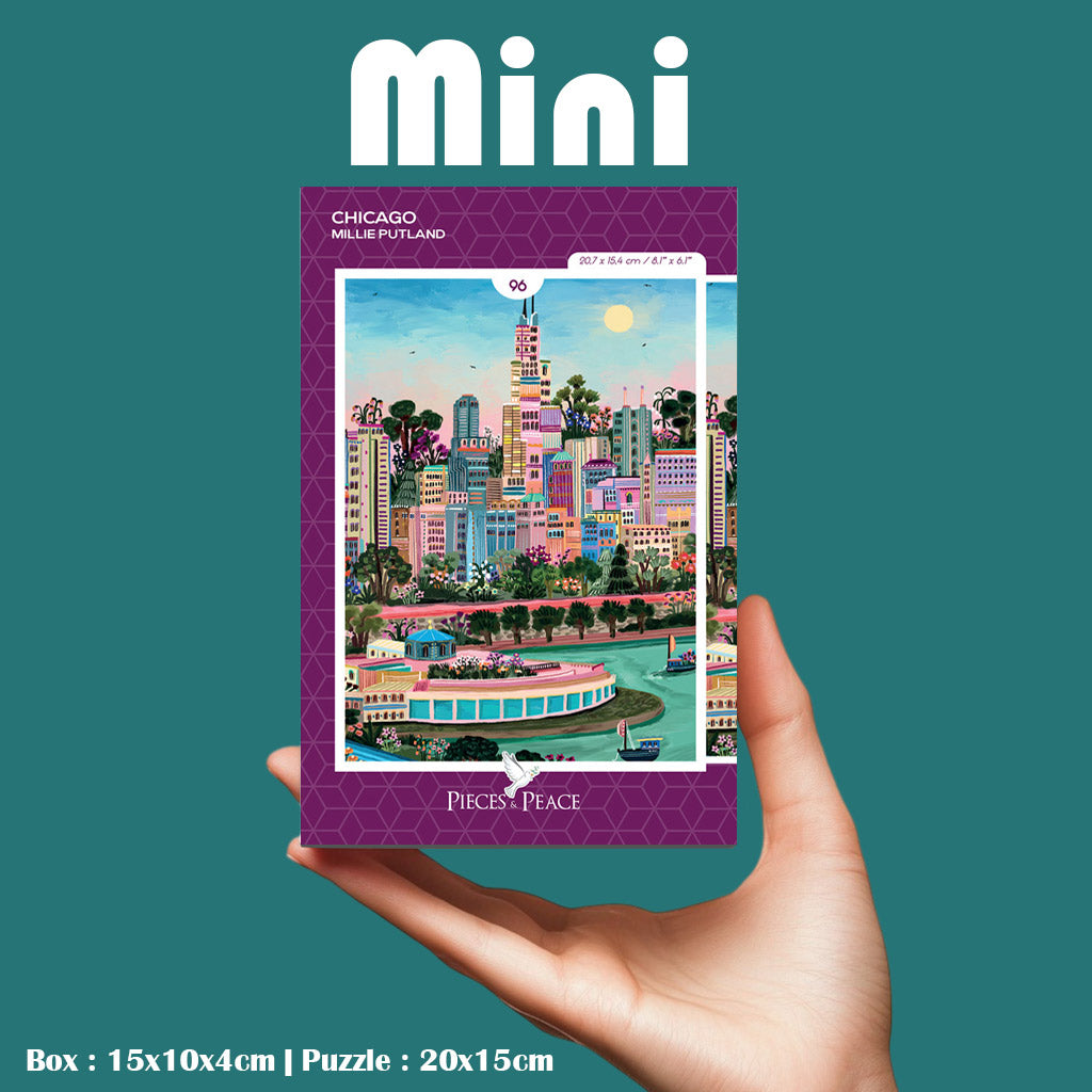 Embarquez pour une escapade urbaine et colorée avec ce mini puzzle Chicago de 96 pièces, une création vibrante signée Putland Millie. Ce puzzle vous invite à explorer la ville de Chicago sous un angle poétique et moderne où les gratte-ciels se mêlent aux espaces verts et aux reflets de la rivière, pour une ambiance à la fois dynamique et apaisante.