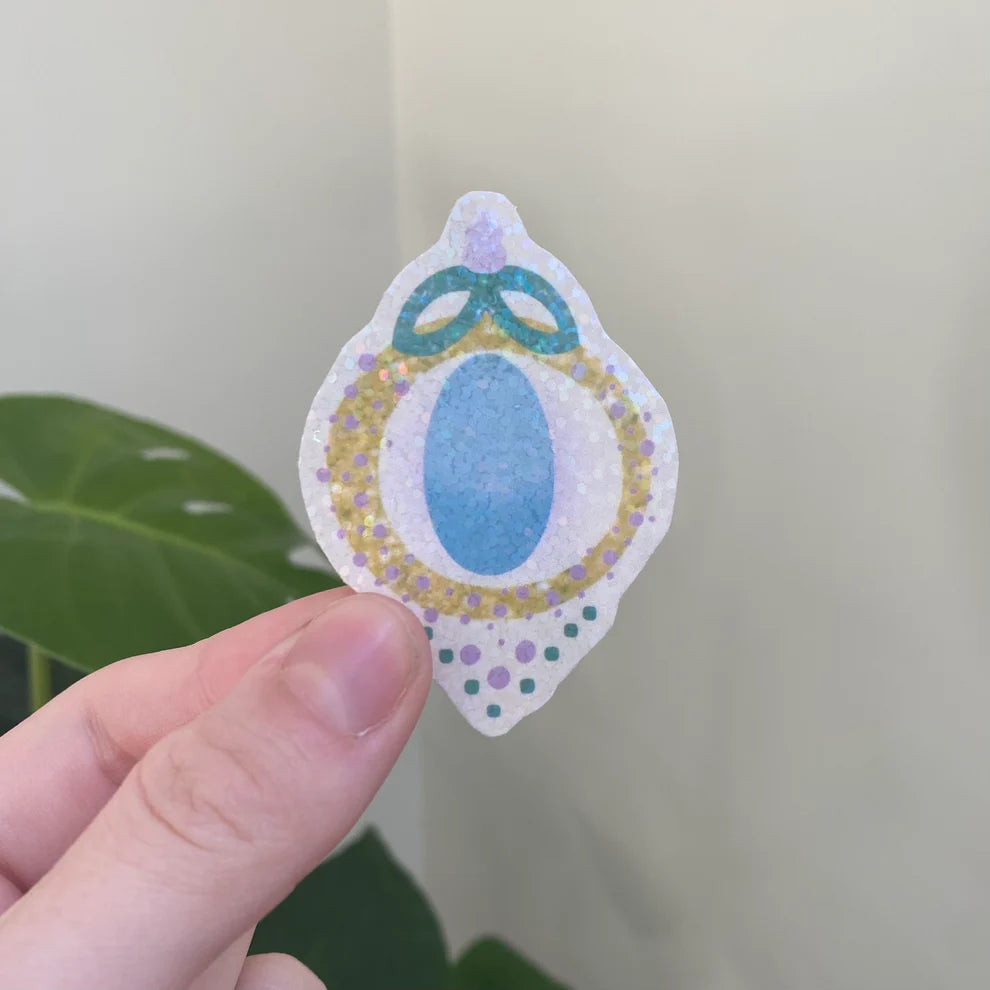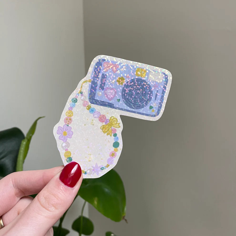 Stickers avec une lamination remplie de petites paillettes holographiques.
