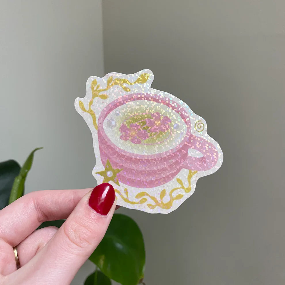 Stickers avec une lamination remplie de petites paillettes holographiques.