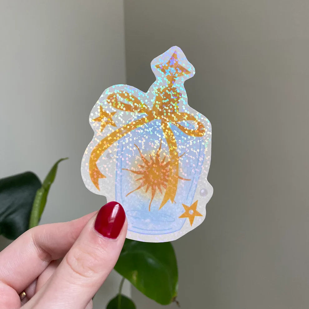 Stickers avec une lamination remplie de petites paillettes holographiques.