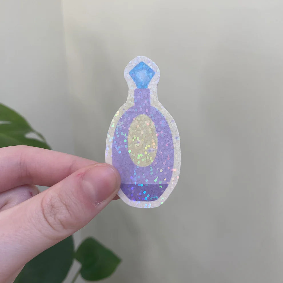 Stickers avec une lamination remplie de petites paillettes holographiques.