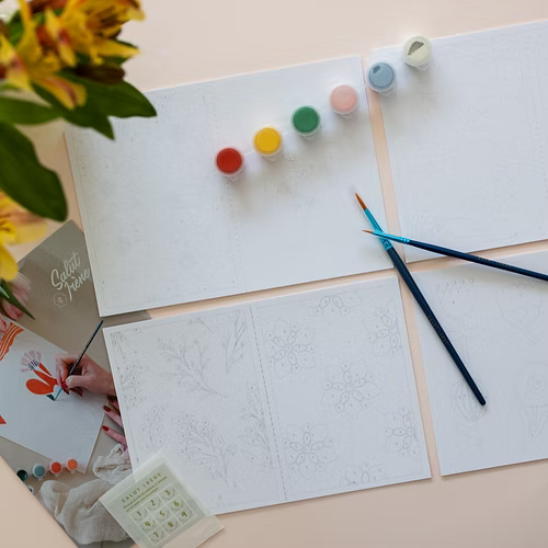 Tout le nécéssaire pour réaliser 8 cartes à peindre hautes en couleurs.