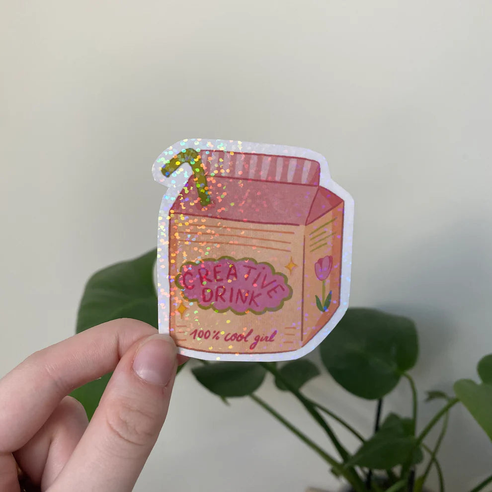 Sticker Creative Drink avec une lamination remplie de petits points holographiques.