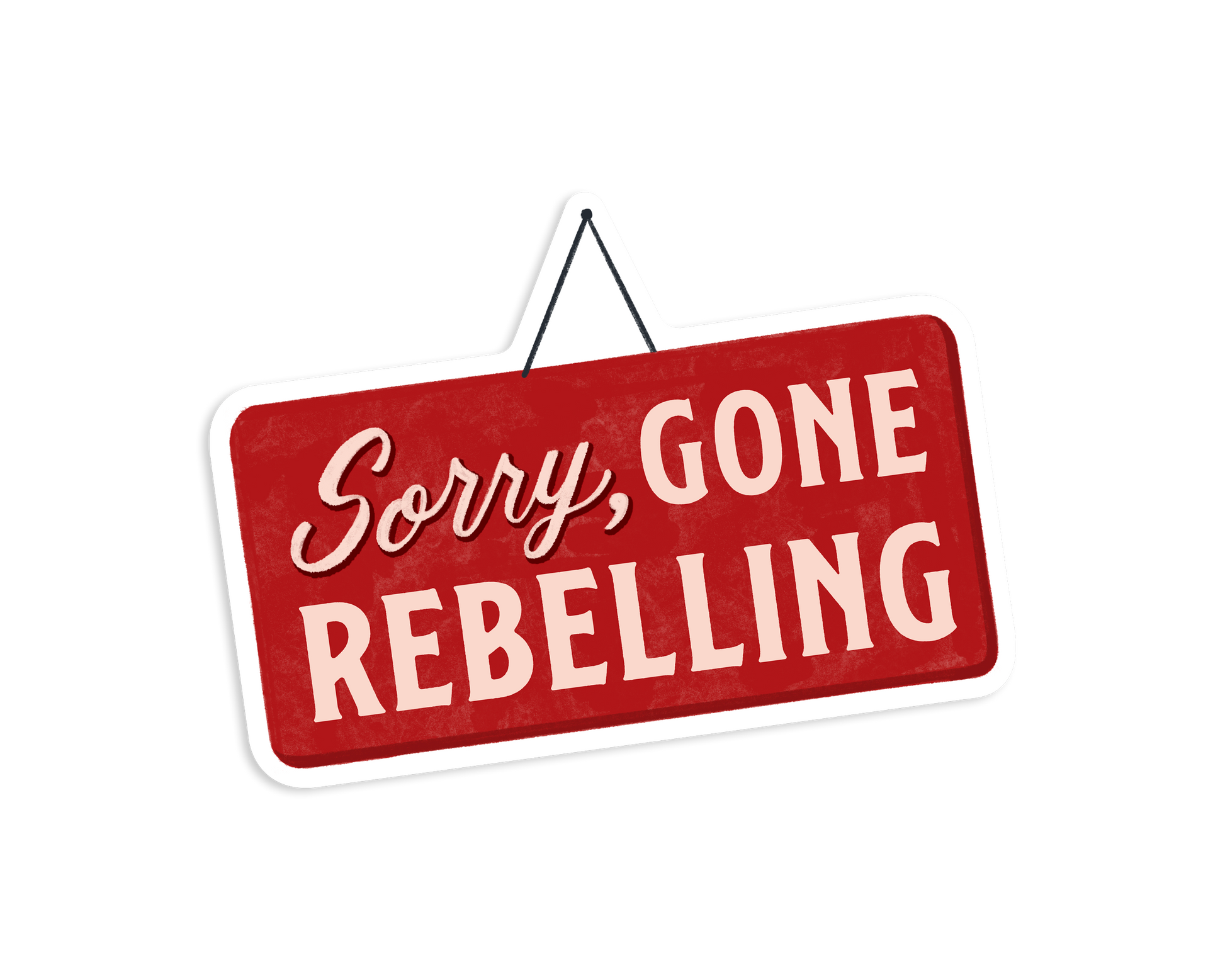 Sticker en vinyle en forme de panneau "Sorry, Gone Rebelling". Prêt à rendre votre espace ou objet plus unique et magique. Finition mat. Résistant à l'eau.